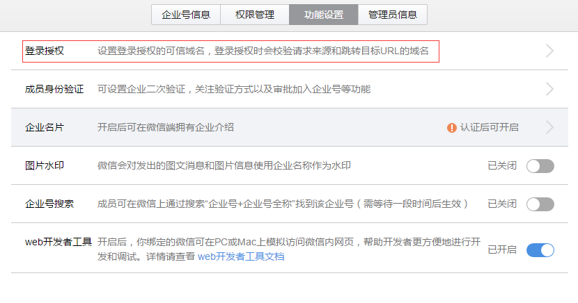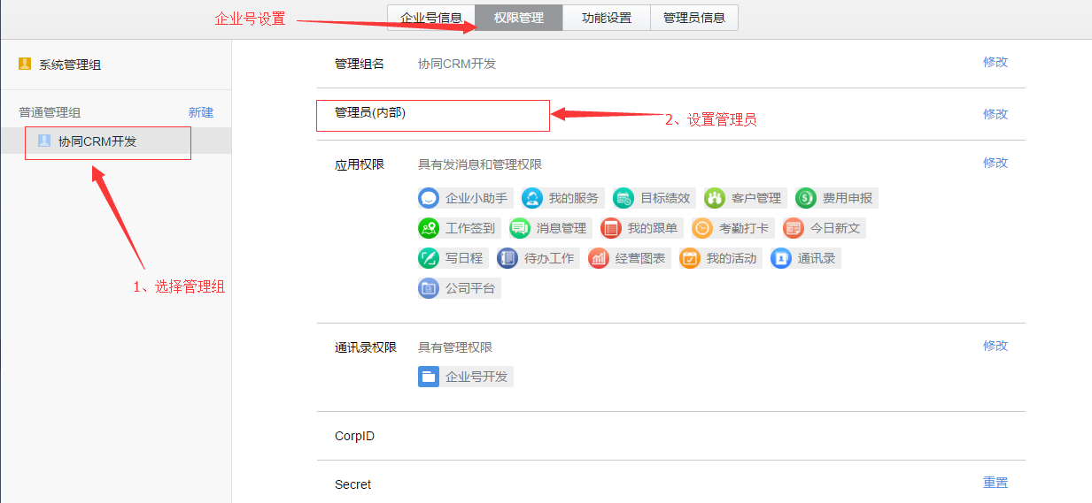 2、以新建的管理员(内部)登录企业号后台设置如下:
